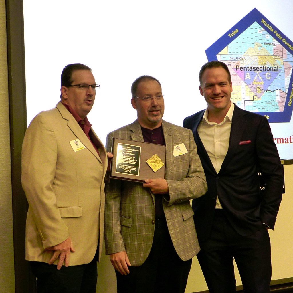 The Oklahoma Chemist Award is the most prestigious award given to a chemist within Oklahoma. The award consists of $1000 as well as a plaque to memorialize the award. A brief description of the accomplishments by the recipient are engraved on the plaque and are submitted, along with a photo of the winner, to Chemical and Engineering News for official publication in a forthcoming issue. Chemical and Engineering News is a major publication of the American Chemical Society and has world-wide distribution. The Oklahoma Chemist Award for 2022 was presented to Dr. Tim Hubin on Saturday, October 8 at the ACS Pentasectional meeting in Bartlesville, OK. Dr. Hubin is the first SWOSU faculty to be given the award, and his achievements at SWOSU have been impressive since he was hired by former SWOSU Chemistry & Physics Chair turned Provost Dr. Blake Sonobe in 2005. Dr. Sonobe is one of the award nominators, and he has a lot to say about Dr. Hubin: