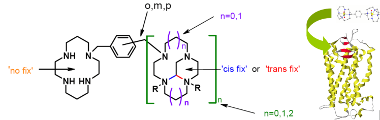 Specific Aims. Due to the wide-ranging potential biomedical applications that might result, our aim is to develop new antagonists for the CXCR4 co-receptor. They are conformationally fixed macrocyclic compounds where the unrestrained equivalent is a known CXCR4 antagonist. We have successfully demonstrated our concept in the synthesis of several of our proposed compounds. We now intend to complete the synthesis and testing of a series of new compounds, and to learn more about the essential design features for this drug class through spectroscopic and biological studies.
